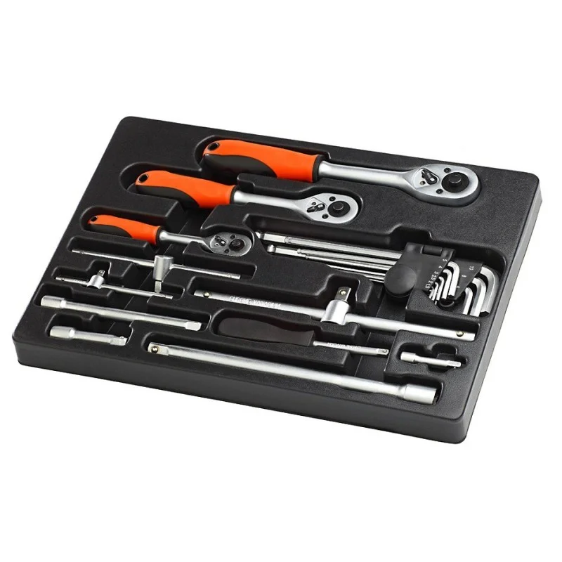 19 delige Ratel / Inbusset met levenslange garantie in kunststof plateau geschikt voor de meest gangbare gereedschapwagens.