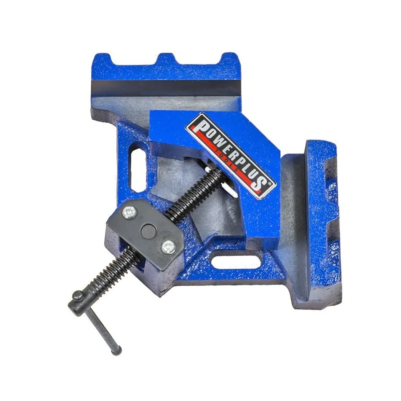 Degelijke gietijzeren spanklem welke d.m.v. bouten op een werkbank kan worden bevestigd en waarmee verschillende werkstukken, hout – metaal etc. onder een hoek van 90° kunnen worden vastgeklemd. Max. werkstukdikte 55 mm.