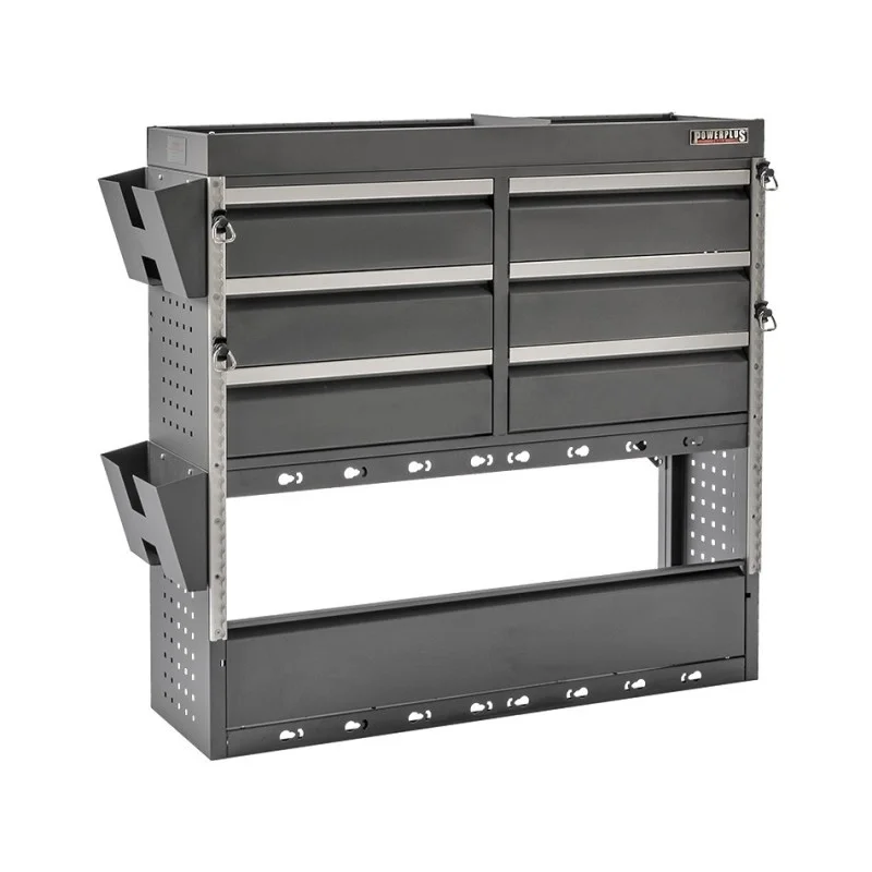 Universele plaatstalen kast met 6 lades en open vakken voor inbouw in bedrijfswagen. Deze representatieve antraciet / matzwart gecoate inbouwkast wordt compleet gemonteerd geleverd en past in vrijwel alle bestelwagens in de lengtes L2, L3 en L4. Heeft u een L1 voertuig kom dan geheel vrijblijvend langs om te checken of één van de Powerplustools inbouwkasten past.