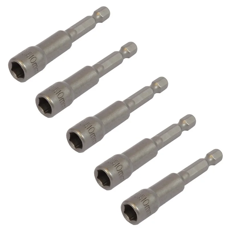 Set van 5 dop bit adapters 1/4" sleutelwijdte 10 mm. lengte 65 mm. - magnetische adapter voor boormachine