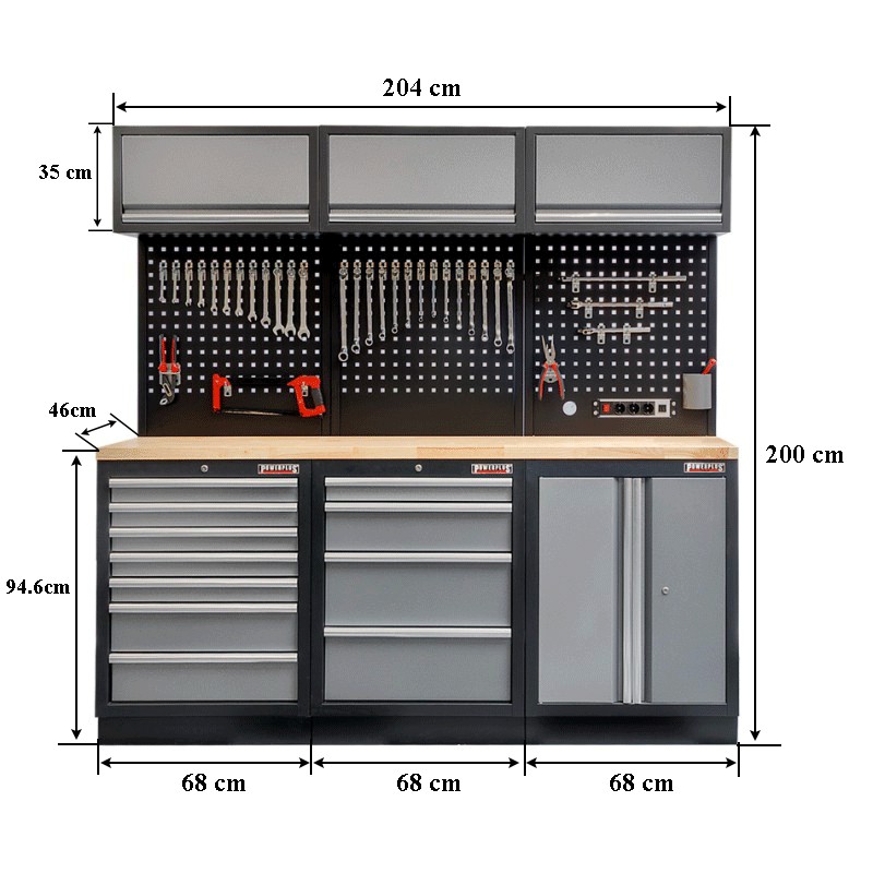 Werkbank set, gereedschapswand matzwart, 3 x hangkast en 11 laden - 204 x 46 x 200 cm werkplaatsinrichting