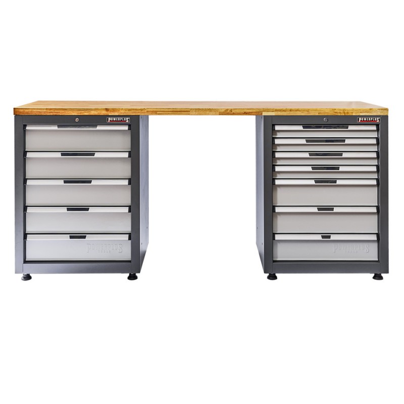 Deze Elite line werkbank met een vijf laden en zeven laden blok heeft een robuuste uitstraling en past qua kleurstelling in vele interieurs. Deze representatieve en zeer degelijke set met een hardhouten werkblad van 210 x 55,5 x 4 cm. is gemaakt voor professioneel gebruik.