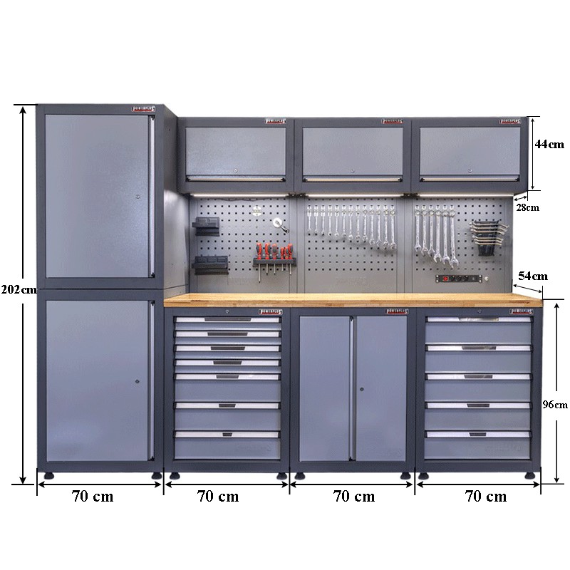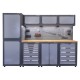 De Elite line werkplaatsinrichting heeft een robuuste uitstraling en past qua kleurstelling in vele interieurs. Deze degelijke set (totaalgewicht 446 kg !) met standaard LED verlichting, welke onder de hangkasten wordt gemonteerd, is daarnaast uitgerust met 220 V stopcontacten, 2 USB poorten en luchtslangaansluiting.
