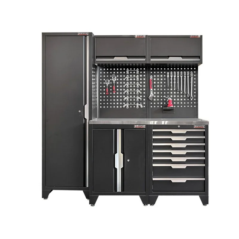 Gereedschapskasten set wandlengte 196 cm.metaal omkleed werkblad, tweedeurs kast, hangkast, hoge kast, gatenwand, matzwart.