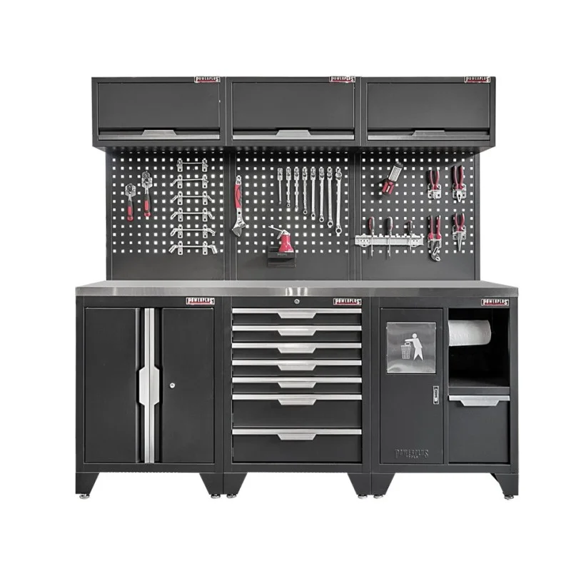 Gereedschapskasten set wandlengte 204 cm. metaal omkleed werkblad, tweedeurs kast, ladenblok, afvalbak, matzwart