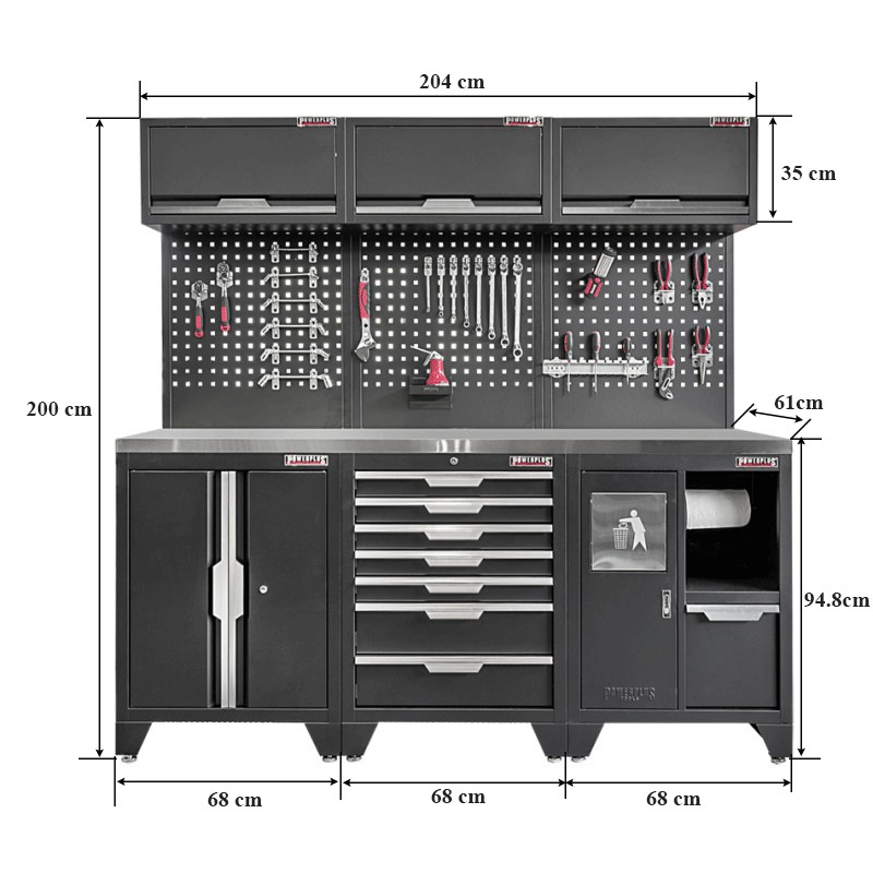 Deze set bestaat uit 1 x werkplaatskast PP-T 2885 met 2 deuren, een chique kast voor het opbergen van grotere producten. Deze gereedschapskast wordt standaard geleverd met 4 verstelbare pootjes in het basisframe waarmee oneffenheden in de vloer kunnen worden opgevangen.