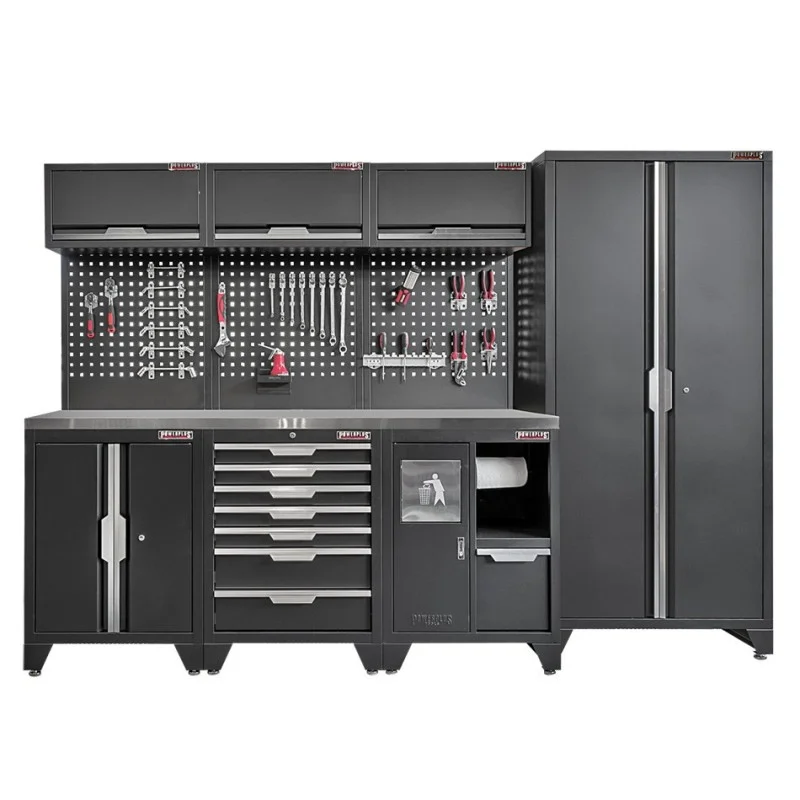 Gereedschapskasten set wandlengte 295,5 cm. metaal omkleed werkblad, tweedeurs lage en hoge kast, afvalbak, gatenwand, matzwart.