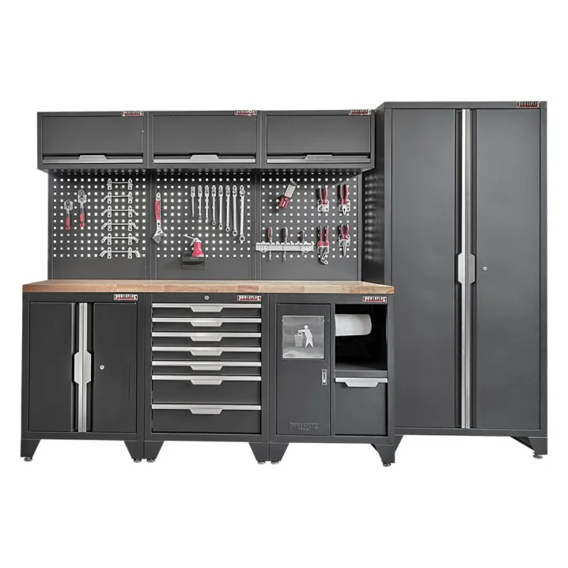 Gereedschapskasten set wandlengte 295,5 cm. tweedeurs lage en hoge kast, ladenblok, afvalbak, gatenwand, matzwart.