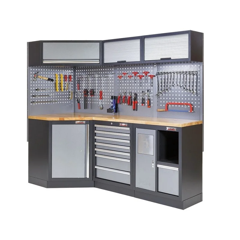 Complete werkplaatsinrichting, gevulde gereedschapskast, werkbank + hoekstuk met hardhouten werkblad, 223 x 200 cm