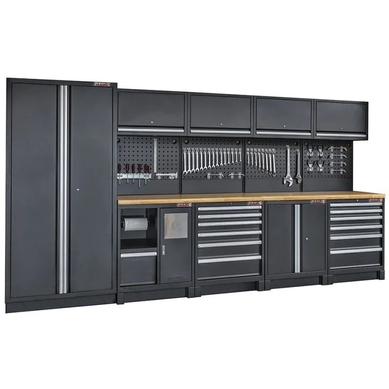 Complete werkplaatsinrichting mat zwart, werkbank + hardhouten blad, gereedschapskast, 12 laden, 379,5 x 200 cm