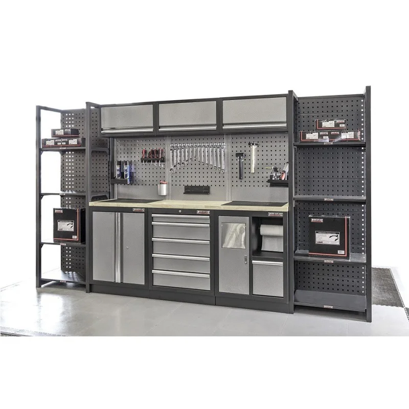 Complete Werkplaatsinrichting, Werkbank set, gereedschapskast, Magazijnstelling, 3 x hangkast, 5 laden, 342 x 200 cm