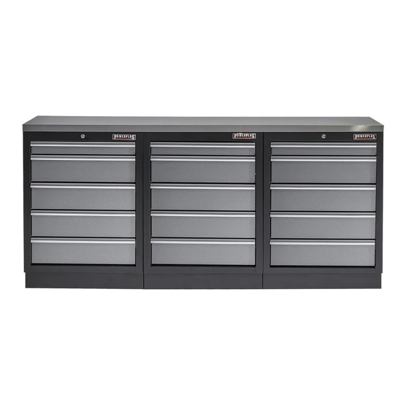 Werkbank set met MDF werkblad met RVS plaat omkleed - 15 laden - 204 x 46 x 94,6 cm. Werkbank met laden - ladenblok
