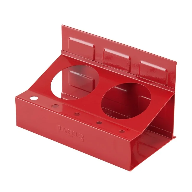 Plaatstalen product voorzien van poedercoating en 6 magneten, geschikt voor 2 x spuitbus of fles max. Ø 75 mm. en 5 x schroevendraaier (2 x Ø 11,5 mm - Ø 10,5 mm - Ø 9,5 mm - Ø 8 mm).
