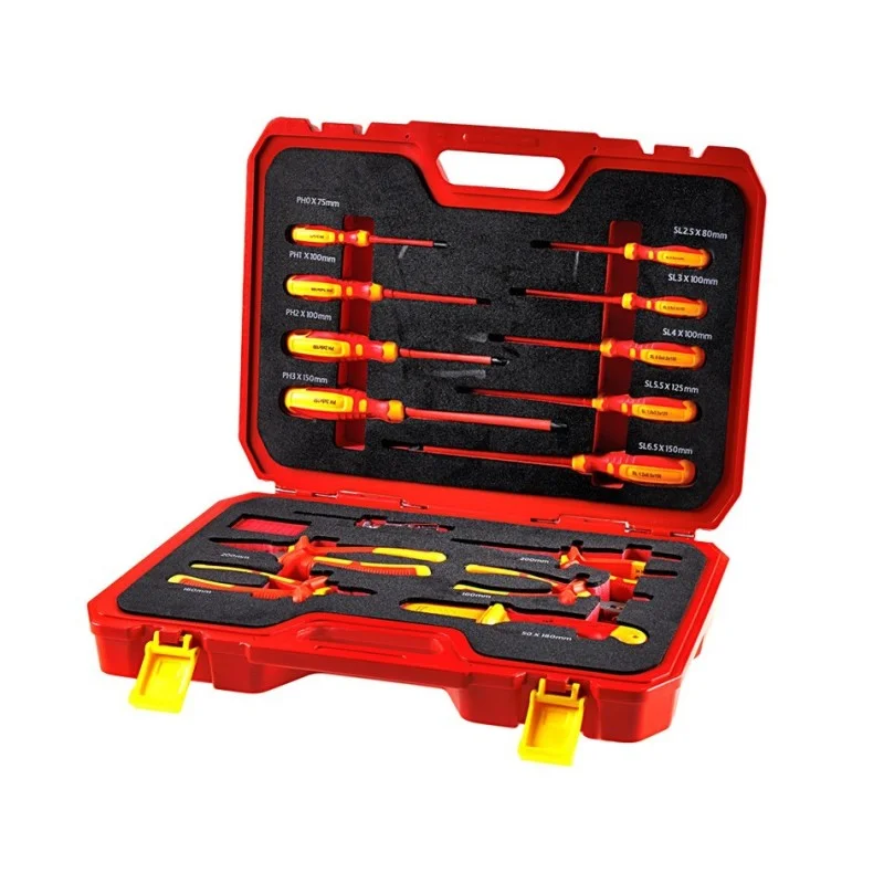 Een degelijke set geïsoleerde gereedschappen voor jarenlang sleutelplezier. De schroevendraaiers en tangen zijn gemaakt van Chrome Vanadium en hebben prettig in de hand liggende handgrepen.
