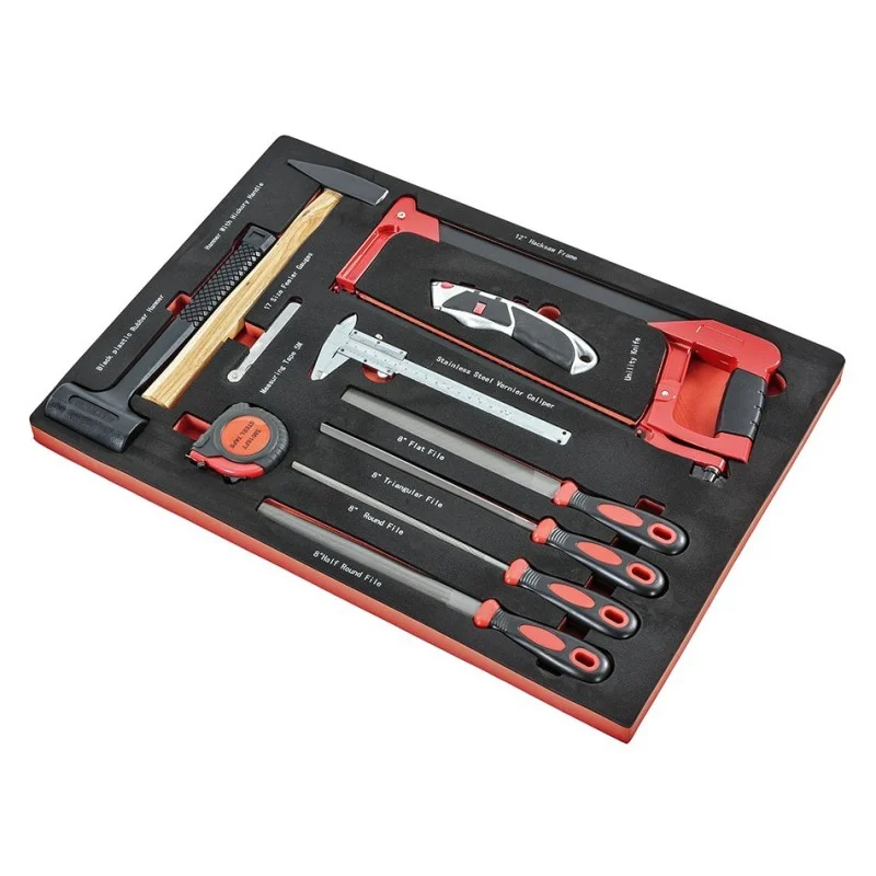Professioneel gereedschap met 2 jaar garantie (m.u.v. slijtdelen) in een overzichtelijke module passend in de Powerplustools gereedschapswagens maar ook in vele andere merken gereedschapswagens. De module met maatgegevens van het desbetreffende gereedschap er op geprint is gemaakt van Ethyleen Vinyl Avetaat ( EVA foam mat ) dit is een zacht, flexibel, taai, UV-en weerbestendig, lichtgewicht en slijtvast materiaal en speciaal ontwikkeld voor dit doel. Voordeel van EVA foam is dat zowel de buitenkant als de binnenkant van hetzelfde materiaal is gemaakt, mocht dit evt. scheuren dan neemt ook de binnenkant geen vocht op.