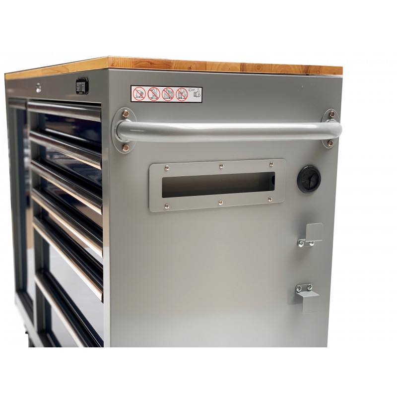 Afmetingen laden: 4 ondiepe lades 66 x 39 x 6 cm. + 2 diepe lades 66 x 39 x 16 cm. + 1 hoge la (34 x 39 x 63 cm. L x B x H) met afsluitbare opbergruimtes en schroevendraaierhouder