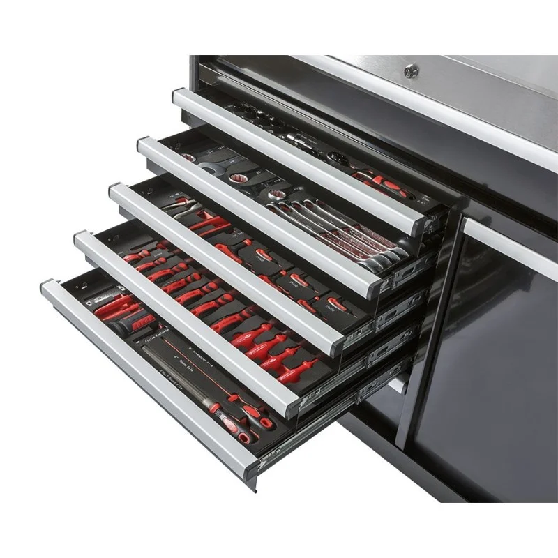 Een professionele gereedschapswagen met daarin 159 gereedschappen met levenslange garantie in overzichtelijke module. De gereedschappen zijn gemaakt van Chrome Vanadium met evt. een breukbestendig kunststof handvat, de modules met maatgegevens van het desbetreffende gereedschap er op geprint zijn gemaakt van Ethyleen Vinyl Avetaat ( EVA foam mat ) dit is een zacht, flexibel, taai, UV- en weerbestendig, lichtgewicht en slijtvast materiaal en speciaal ontwikkeld voor dit doel. Voordeel van EVA foam is dat zowel de buitenkant als de binnenkant van het zelfde materiaal is gemaakt, als het materiaal evt. zou scheuren neemt ook de binnenkant geen vocht op.