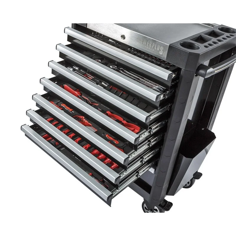 Een professionele gereedschapswagen met daarin 221 gereedschappen met levenslange garantie in overzichtelijke module. De gereedschappen zijn gemaakt van Chrome Vanadium met evt. een breukbestendig kunststof handvat, de modules met maatgegevens van het desbetreffende gereedschap er op geprint zijn gemaakt van Ethyleen Vinyl Avetaat ( EVA foam mat ) dit is een zacht, flexibel, taai, UV- en weerbestendig, lichtgewicht en slijtvast materiaal en speciaal ontwikkeld voor dit doel. Voordeel van EVA foam is dat zowel de buitenkant als de binnenkant van het zelfde materiaal is gemaakt, als het materiaal evt. zou scheuren neemt ook de binnenkant geen vocht op.