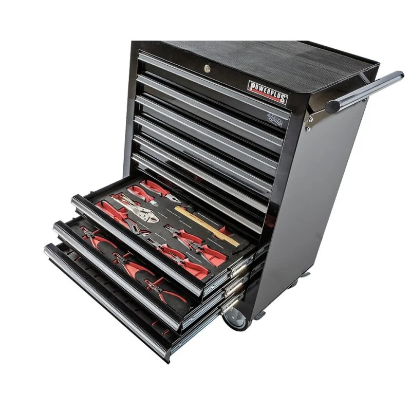 Gevulde gereedschapswagen zwart, 9 laden gevuld met gereedschap in foam inleg