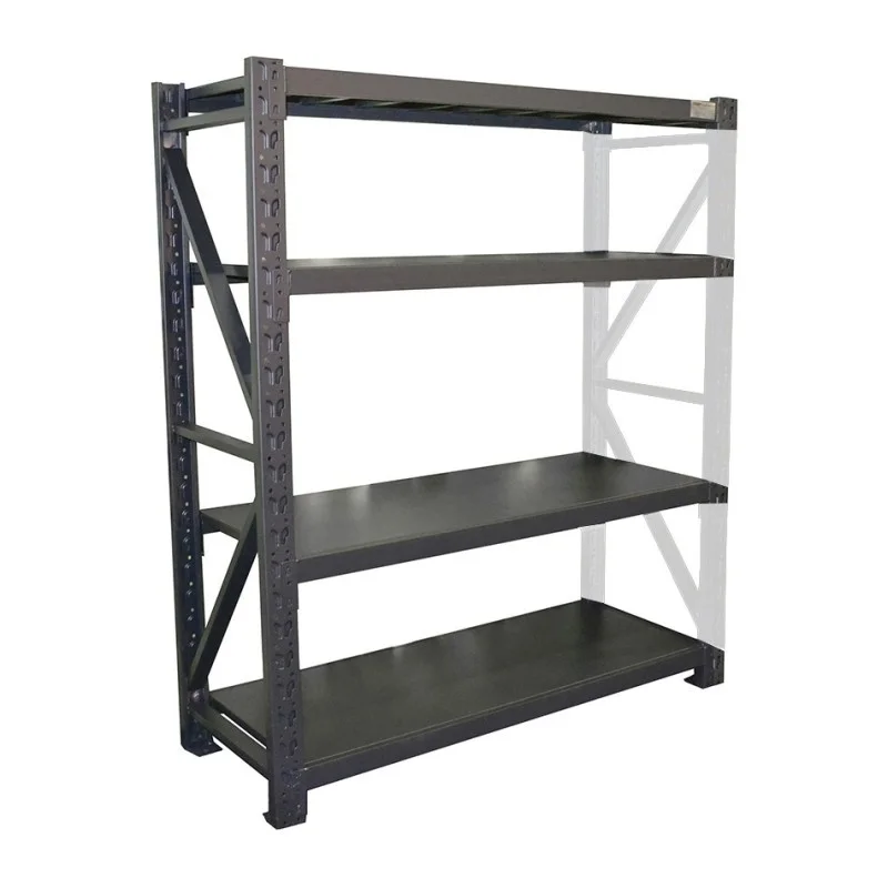 Degelijke ijzeren verlengset voor magazijnstelling 1764 bestaande uit 1 staander, 8 liggers en 4 plaatstalen legborden.