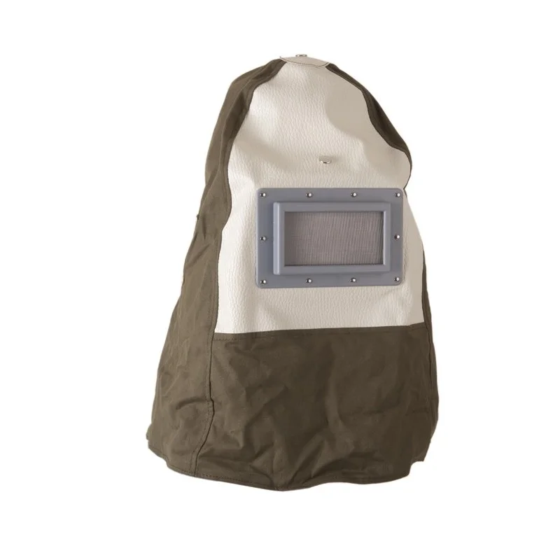 Helm van kunststof met daaroverheen een zachte beschermhoes, het glazen venstertje met gaasje is uitwisselbaar.