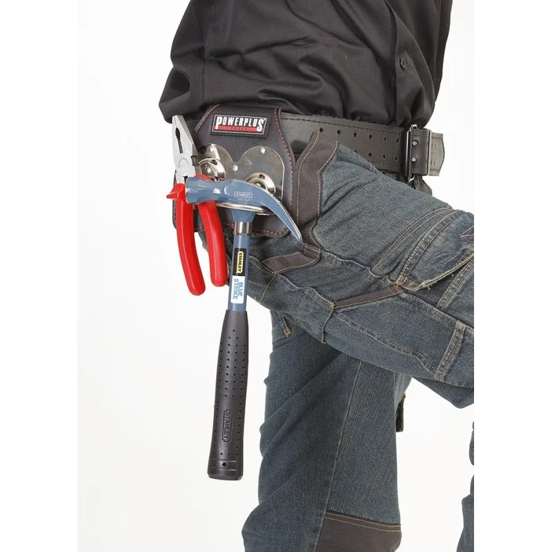 Handgemaakte lederen hamerhouder type swing met verchroomde metalen hamerhaak ( 5 x 5 cm.) en extra haak voor schroevendraaier of tang.