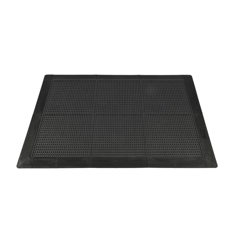 Dit type mat is ook geschikt voor gebruik in natte ruimtes en is leverbaar in de kleuren zwart en grijs. De bijpassende oprijranden en hoekstukjes leveren we in de kleuren zwart, grijs, geel en rood.