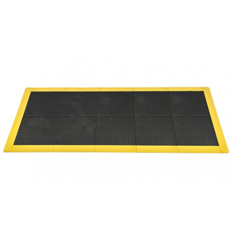 Deze werkbankmat met de afmetingen 216 x 96 cm. bestaat uit 10 zwarte kliktegels 40 x 40 x 1,2 cm., 7 gele oprijranden mnl. en 7 gele oprijranden vrl. plus 4 gele hoekstukken. Eenvoudig te leggen en gemakkelijk op te ruimen.