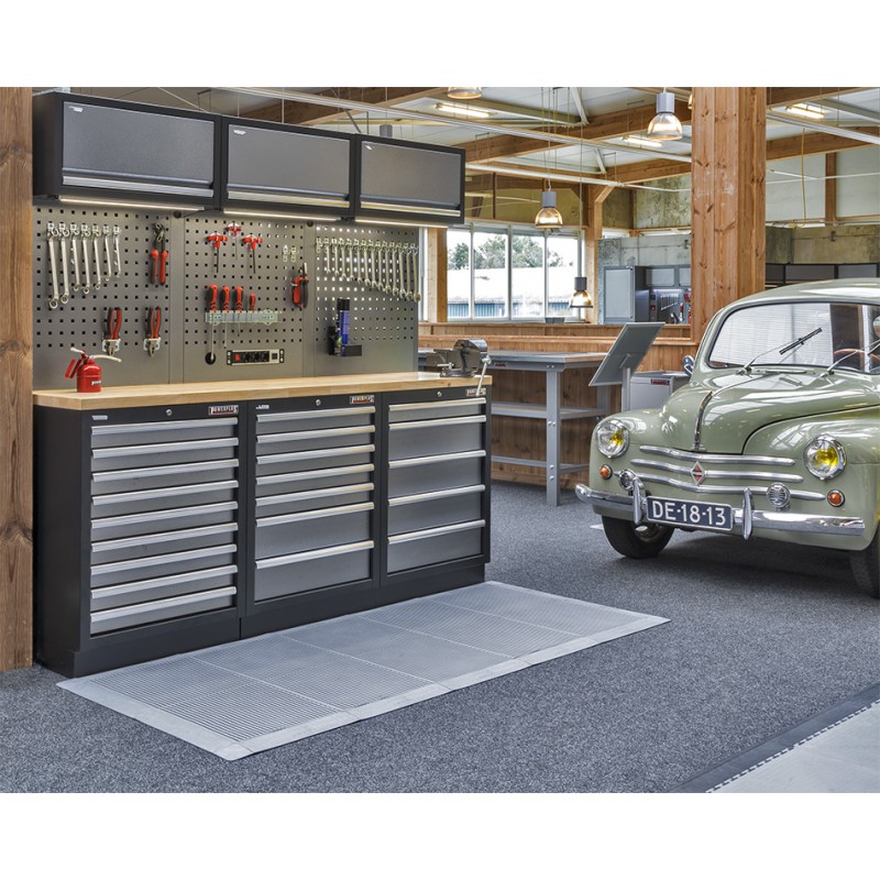 Deze werkplaatstegels zijn eenvoudig te leggen en leverbaar in de kleuren zwart en grijs, de bijpassende oprijranden en hoekstukjes leveren we in de kleuren zwart, grijs, geel en rood.