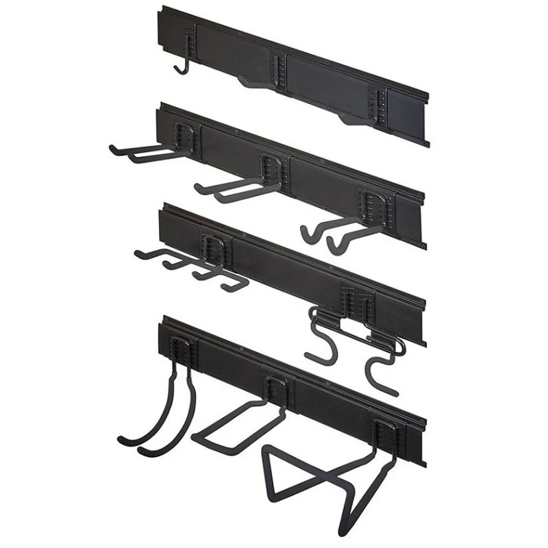 Een effectieve manier om ruimtebesparend uw (tuin)gereedschap op te bergen, deze set met 4 strippen schroeft u horizontaal aan de wand waarna u de strippen flexibel d.m.v. meegeleverde haken kunt indelen.