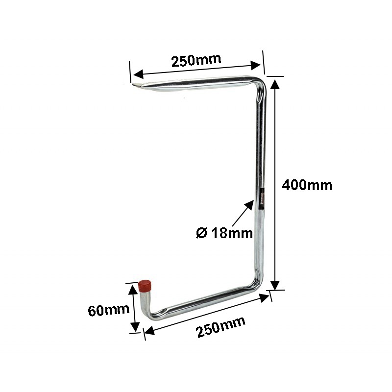 Lengte onderste haakdeel: 250 mm. (van wand tot voorkant haak) effectieve deel tussen achterste Ø 12 mm. buis en voorste verticale deel met kunststof dop: 220 mm.
