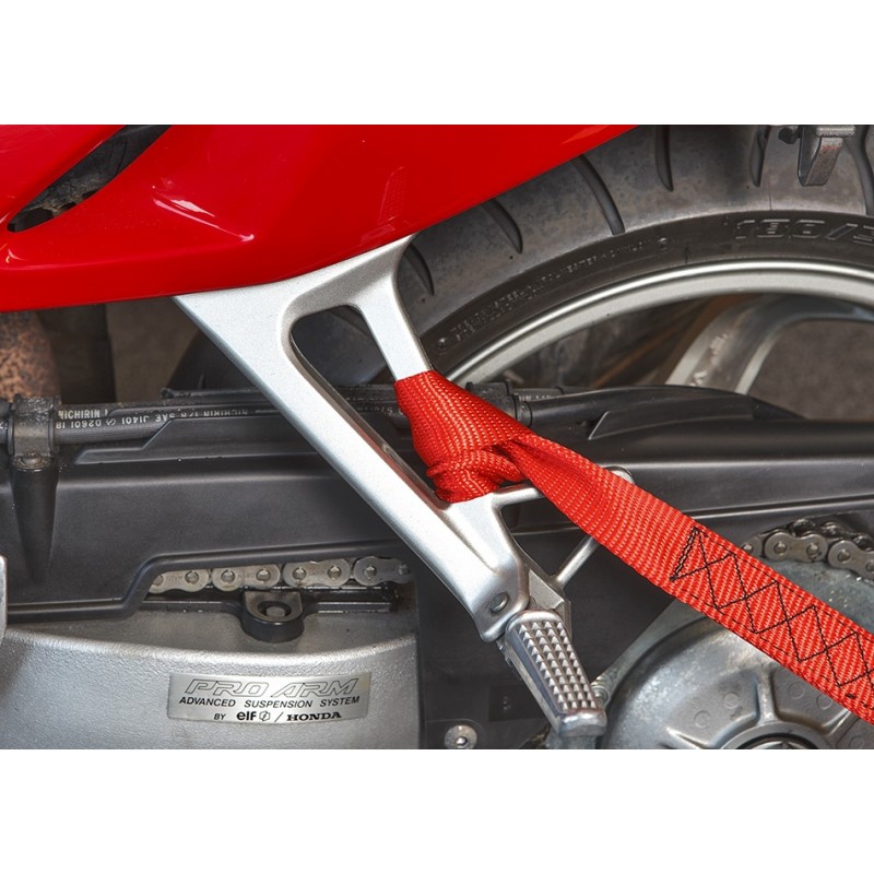 Losse spanband met dubbele lus die speciaal ontwikkeld is voor het vervoer van motorfietsen.