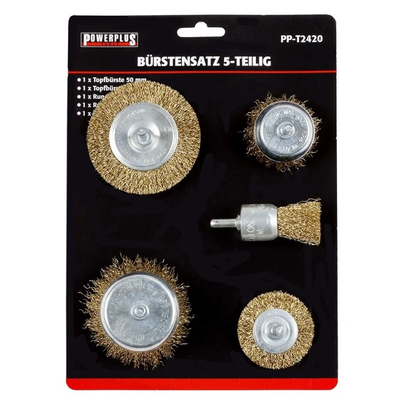 Set van 5 borstels: 2 staalborstels: 50 en 75 mm + 3 komborstels: 25, 50 en 75 mm. Op 6 mm stift met gegolfde staaldraad