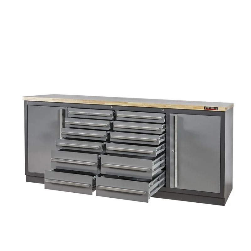 Professionele werkbank – montagetafel 215 x 70 x 95 cm. met 12 laden, 2 gereedschapskasten en houten werkblad