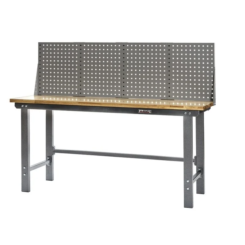 Topkwaliteit werkbank van Powerplustools met oerdegelijk ijzeren frame en poten van dikwandig kokerprofiel (80 x 40 mm.) Deze professionele zware werkbank wordt geleverd inclusief een glad gelakt vingerlas verlijmd hardhouten blad van 3,5 cm. dik. Een ideale stalen werkbank voor school, autogarage, werkplaats, particulier. Deze industrieel inzetbare werkbank is verkrijgbaar in de kleuren grijs en zwart. De hoogwaardige poedercoating is UV bestendig en het frame wordt samen geschroefd met gegalvaniseerde bouten en moeren (boutkwaliteit 4.8 )