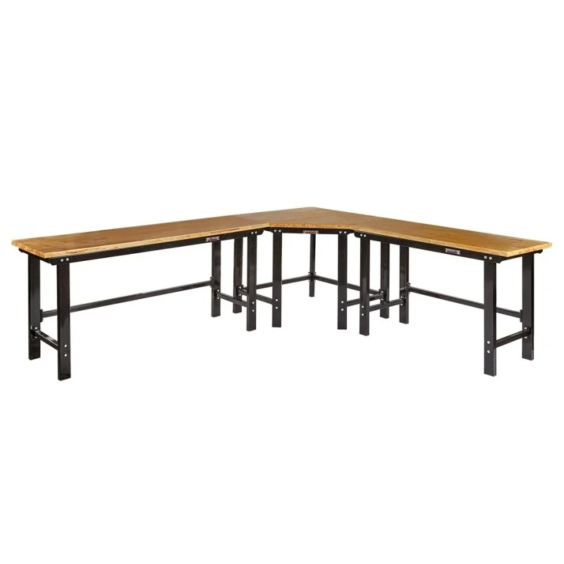 Topkwaliteit werkbank hoek opstelling van Powerplustools met oerdegelijk ijzeren frame en poten van dikwandig kokerprofiel (80 x 40 mm.) Deze professionele zware werkbank wordt geleverd inclusief een glad gelakt vingerlas verlijmd hardhouten blad van 3,6 cm. dik. Een ideale stalen werkbank voor school, autogarage, werkplaats, particulier. Deze industrieel inzetbare werkbank hoekopstelling is verkrijgbaar in de kleuren grijs en zwart en is zowel aan de linker als de rechterkant uit te breiden met werkbanken in lengtes van 100 - 120 - 150 en 200 cm. De hoogwaardige poedercoating is UV bestendig en het frame wordt samen geschroefd met gegalvaniseerde bouten en moeren (boutkwaliteit 4.8 )