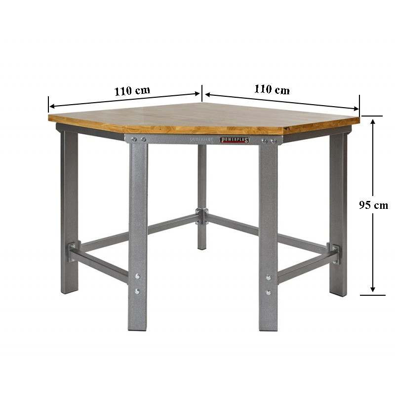 Topkwaliteit werkbank hoekopstelling van Powerplustools met oerdegelijk ijzeren frame en poten van dikwandig kokerprofiel (80 x 40 mm.) Deze professionele zware werkbank wordt geleverd inclusief een glad gelakt vingerlas verlijmd hardhouten blad van 3,5 cm. dik. Een ideale stalen werkbank voor school, autogarage, werkplaats, particulier. Deze industrieel inzetbare werkbank hoekopstelling is verkrijgbaar in de kleuren hamerslag grijs en glanzend zwart en is zowel aan de linker als de rechterkant uit te breiden met werkbanken in lengtes van 100 - 120 - 150 en 200 cm. De hoogwaardige poedercoating is UV bestendig en het frame wordt samen geschroefd met gegalvaniseerde bouten en moeren (boutkwaliteit 4.8 )
