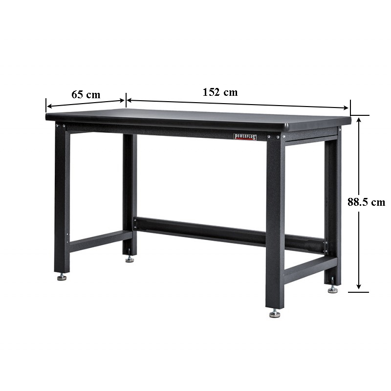 Degelijke montagetafel met gecoat stalen frame en daarop een niet geleidend MDF bovenblad met PVC omkleed. Kleur: frame met zwarte poedercoating in speciaal motief, bovenblad: zwart / antraciet. Afm. 152 x 65 x 88,5 cm. Dikte van het bovenblad: 40 mm. Voorzien van 4 stelpootjes voor fijn-afstelling op een niet geheel vlakke bodem.