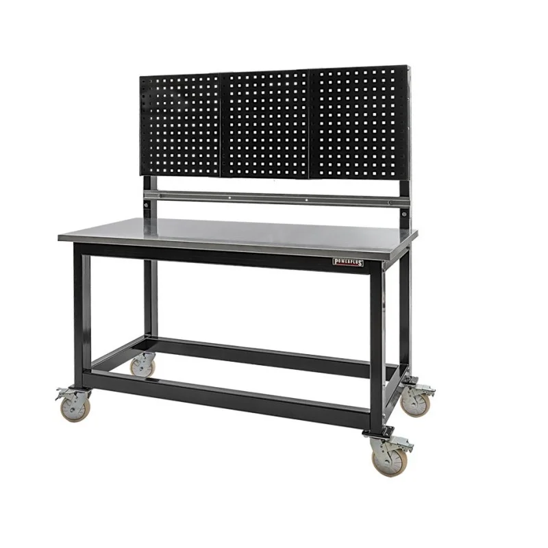 Professionele verrijdbare werkbank met 4,5 cm. dik werkblad van MDF met daaromheen een verzinkte metalen plaat. Levering is inclusief gereedschapsbord en metalen strip voor het ophangen van kunststof bakken.