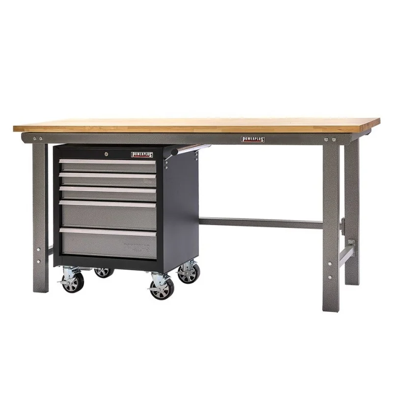 Werkbank grijs 200 cm met hardhouten blad en gereedschapswagen