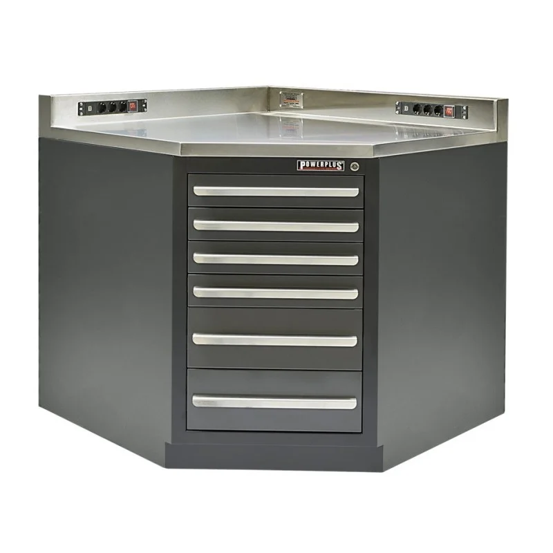 Een mooie aanvulling op de werkbanken PP-T 2740 – 2741 en 2742 is dit passende hoekstuk met 6 grote lades. Het geheel is voorzien van een luxe RVS bovenblad. Deze hoogwaardige werkbank heeft als basis een gelast frame en wordt compleet gemonteerd geleverd