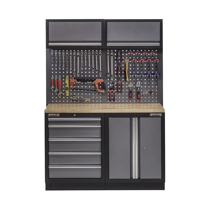 Werkbank set met hardhouten blad, gereedschapskast, gereedschapsbord 2 x hangkast - 5 laden - 136 x 46 x 94,5 / 199,5 cm