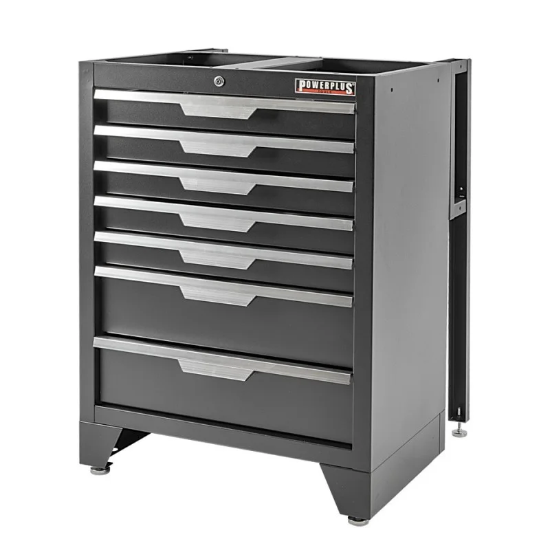 Degelijke werkplaatskast met 7 laden, de meest populaire uitvoering met 5 ondiepe en 2 diepe laden. Deze gereedschapskast wordt standaard geleverd met 4 verstelbare pootjes in het basisframe waarmee oneffenheden in de vloer kunnen worden opgevangen.
