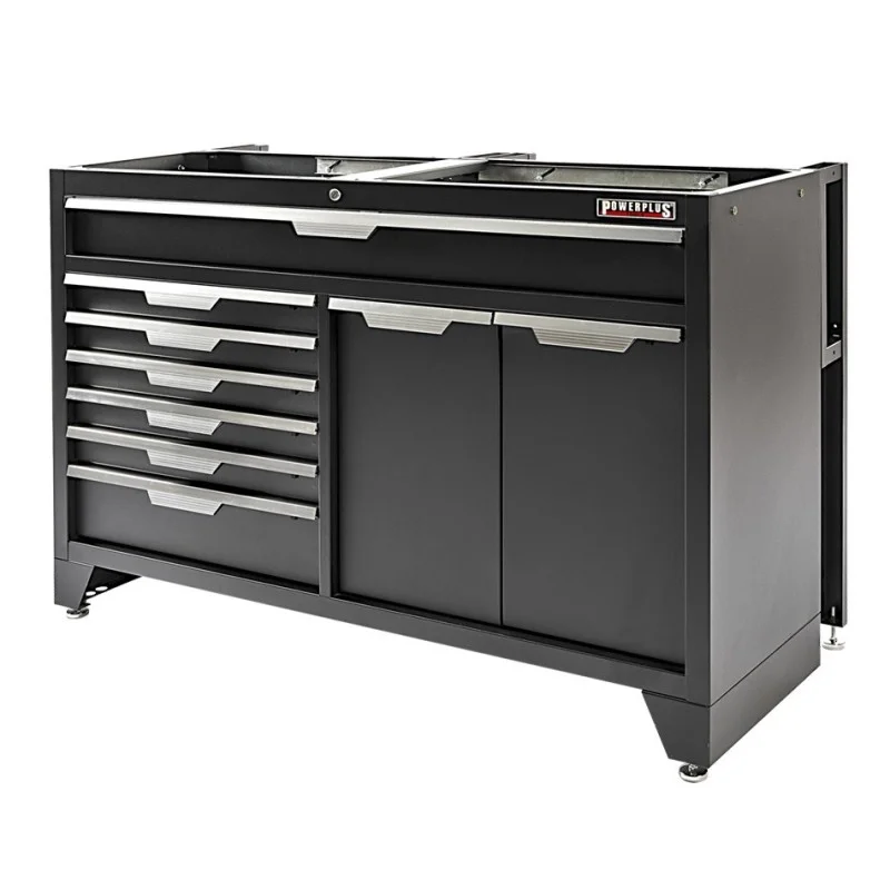 Chique werkplaatskast met 1 brede lade, 6 lades van 56,5 cm. breed + 1 hoge schuifla met kunststof afvalbak en 1 schuiflade met 18 kunststof magazijnbakjes. Deze gereedschapskast wordt standaard geleverd met 4 verstelbare pootjes in het basisframe waarmee oneffenheden in de vloer kunnen worden opgevangen.