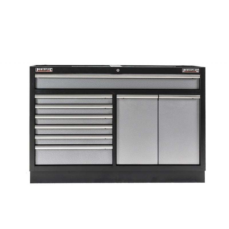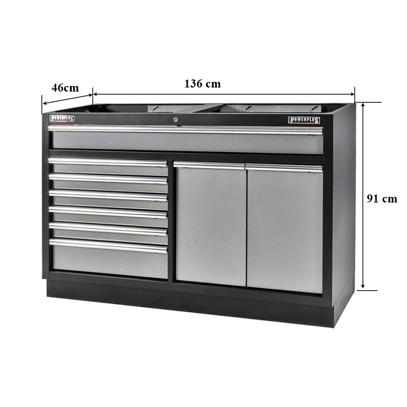 Stalen onderframe met zes in hoogte verstelbare pootjes voor twee premium line kasten. Geschikt voor Powerplustools artikelnummer: 0884-0885-0886-1156-1173-1174-1766. Afmetingen: 136,5 x 44 x 11,5 tot 15,5 cm. (in hoogte verstelbaar) Gewicht: 7 kg. Uw kasten komen door het gebruik van dit frame minimaal 11,5 cm. hoger te staan.