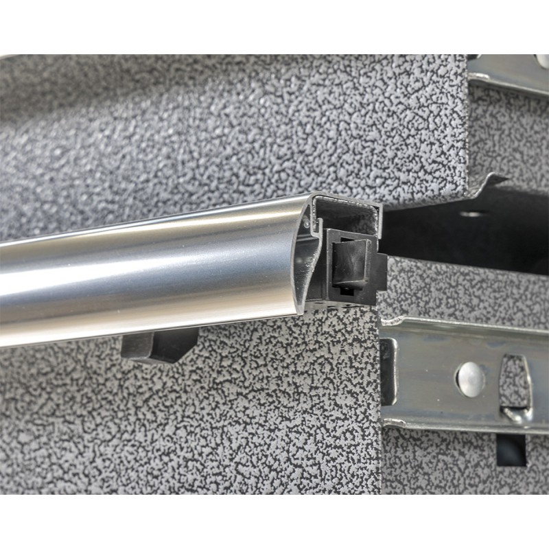 Set van 2 plastic strips met inkepingen voor 35 gereedschappen. Voorzien van kleefstrips om te bevestigen in de laden. De strips kunnen eenvoudig op de juiste lengte worden gemaakt. 60 cm lang. 25 mm. hoog. De vrije ruimte tussen de punten betreft 12 mm.